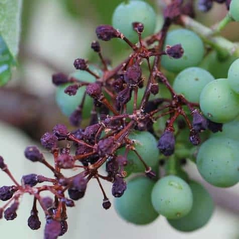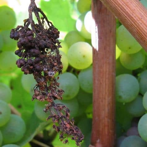 Lorsque la maladie est avancée, les feuilles infectées tombent. Les grappes de fruits peuvent également être infectées, ce qui génère la plupart des pertes de rendement. En cas d'infection, les grappes se ratatinent, brunissent et meurent (Baies de cuir, (fig. 5 & 6). Le risque d'infestation est donc présent à chaque stade de développement, raison pour laquelle Peronospora souvent considérée comme la plus dangereuse des maladies de la vigne sera.
